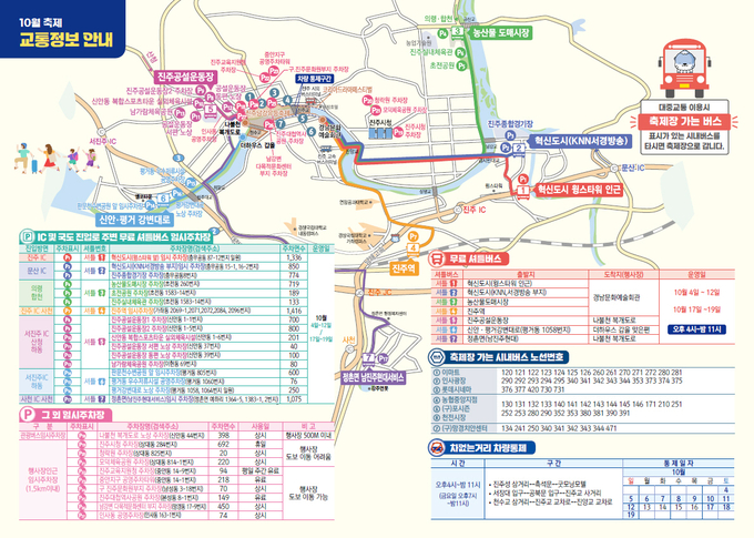 진주시가 오는 10월 4일부터 19일까지, 16일간 개최되는 10월 축제기간 관람객들이 안전하고 편리하게 축제장을 방문할 수 있도록 맞춤형 교통서비스를 제공한다.