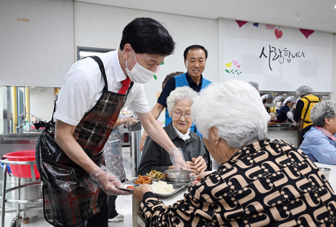 안병구 밀양시장이 추석을 앞두고 종합사회복지관에서 배식 봉사에 참여하며 어르신들과 명절 인사를 나누고 있다.