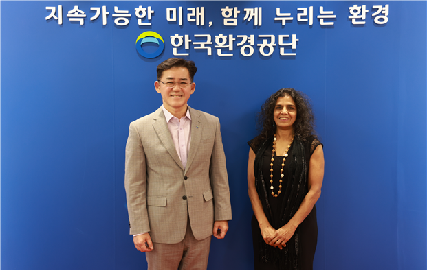 9월 29일 한국환경공단 임상준 이사장(왼쪽)은 UNEP(유엔환경계획) 산업경제국 쉴라 아가르왈 칸 국장과 회담에서 K-EPR 세계화 추진을 협의했다. |