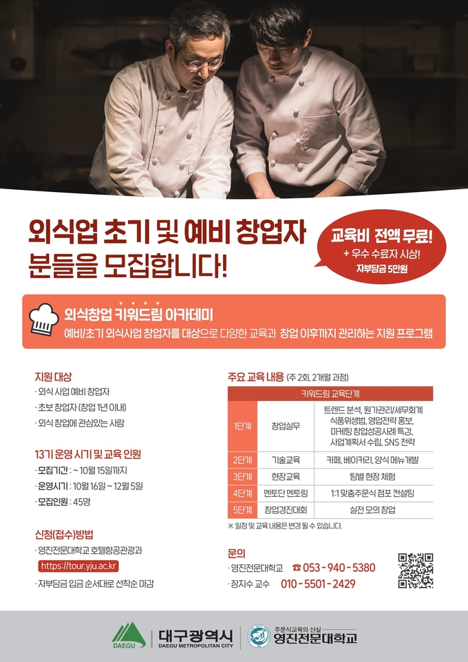 노권율 대구광역시 위생정책과장은 “외식 분야는 어려운 영업환경 속에서 준비된 자만이 살아남을 수 있는 시장”이라며, “키워드림 아카데미는 외식 창업에 도전하는 예비 창업자들에게 맞춤형 교육과 체계적인 사후관리로 차별화된 경쟁력을 확보하고 지속 가능한 발전을 이끌어갈 것”이라고 말했다.