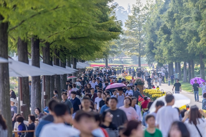 순천만국가정원에 관광객들이 인산인해를 이루고 있다.