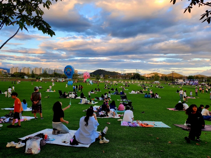 연휴기간 시민들이 오천그린광장에서 휴식을 취하고 있다.