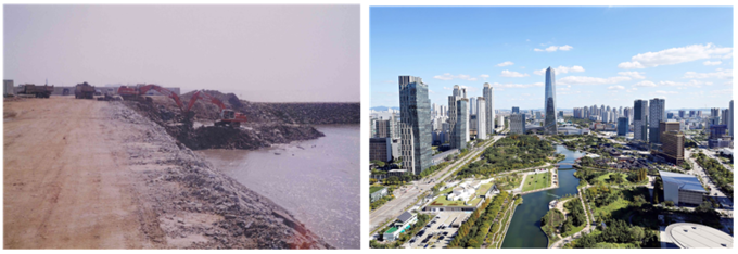 <송도 국제도시의 어제와 오늘 _ 좌, 2002년 송도매립 초기 우, 2024년 송도국제도시>