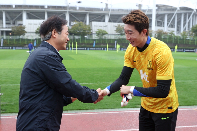 2. 훈련에 들어가기 전 손흥민 선수와 악수하고 있는 이동환 고양특례시장