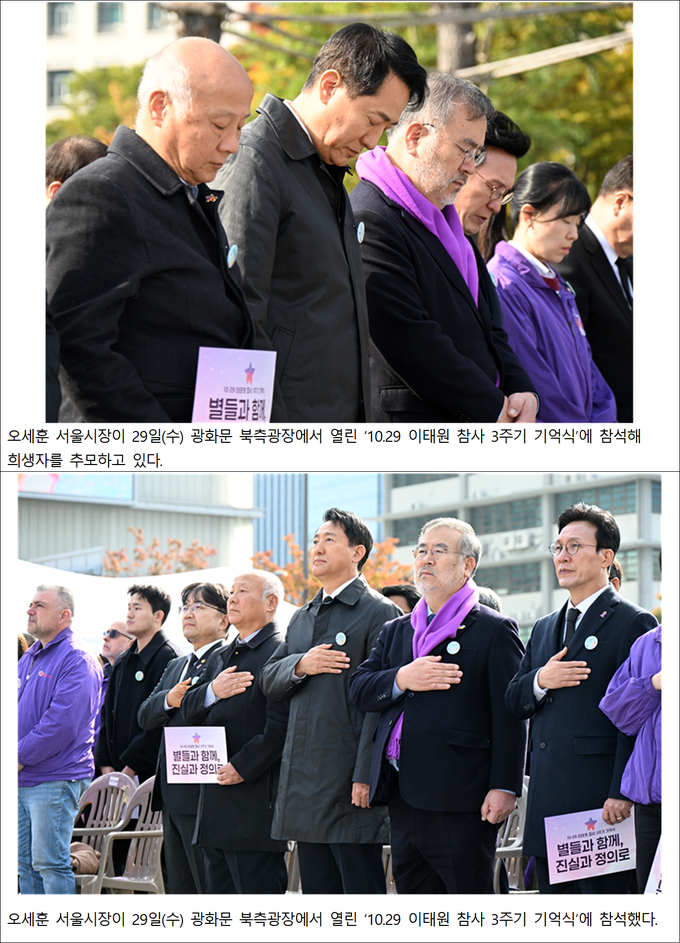 앞서 서울시는 지난 25일(토) 저녁 서울광장에서 행안부, 유가족협의회, 시민대책회의와 공동으로 10.29 이태원참사 3주기 시민추모대회를 열어 희생자를 추모했다.