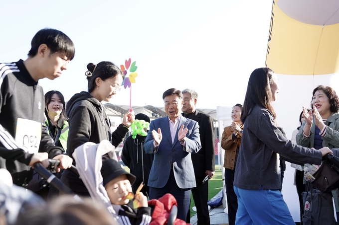 신상진 성남시장이 ‘우리가족 꼬마영웅 유아차 올림픽’ 현장 찾아 참여 가정을 응원하고 있다.