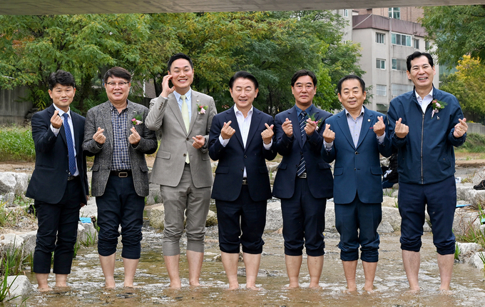 ▶사진 설명 1~3번: 김동근 시장이 10월 31일 ‘호원천 생태하천 복원사업 준공식’에서 참석자들과 기념사진을 찍고 있다.