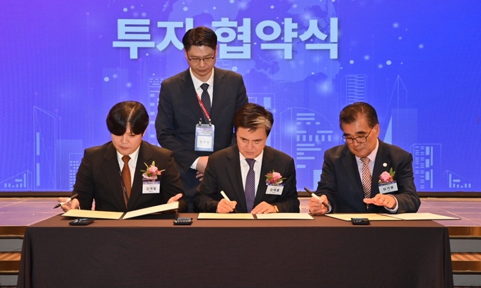 투자협약(김대일 데일리킹 대표이사, 김태흠 충남도지사, 김기웅 서천군수)