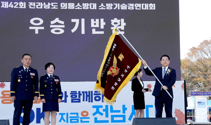 김영록 전라남도지사가 4일 담양군 추성경기장에서 열린 ‘제42회 전라남도 의용소방대 소방기술경연대회’에서 전년도 우승기를 반환받고 휘날리고 있다.