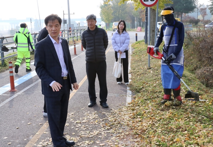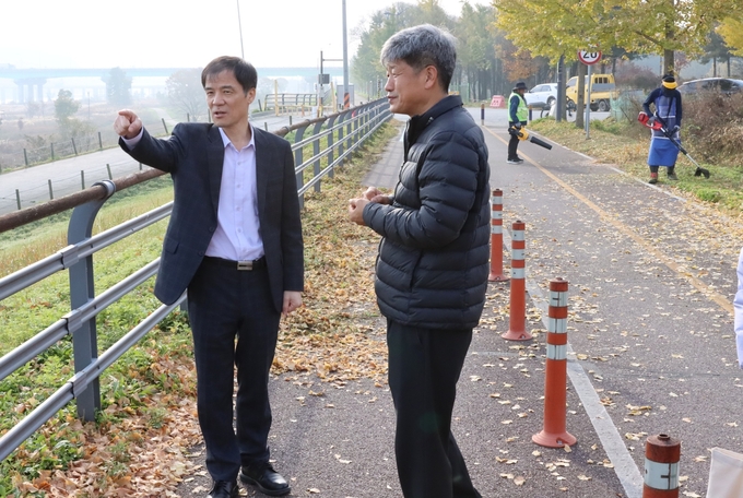 홍동곤 한강유역환경청장(왼쪽)이 6일 경기도 여주시 연양제 자전거도로를 방문하여, 안전사고 예방 대책을 점검했다. 2025.11.06. <한강유역환경청 제공>