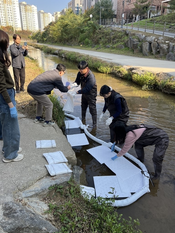 이번 방제훈련은 하천 인근의 하수관로로 폐유가 무단 투기돼 민락천으로 유입되는 상황을 가정해 진행했다.