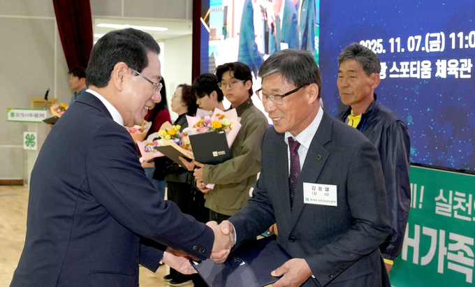 김영록 전라남도지사가 7일 영광스포티움 국민체육센터에서 열린 ‘2025 전남 4-H가족 어울림한마당’에서 유공자 시상을 하고 기념촬영을 하고 있다.