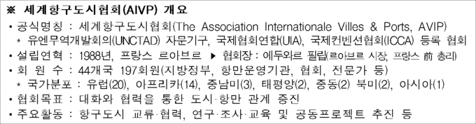 1988년 설립된 세계항구도시협회(AIVP)는 지방정부, 항만운영기관, 전문가 등 44개국 197개 회원을 보유한 국제협회로 항구도시 간 국제교류와 협력을 도모하고 있다.