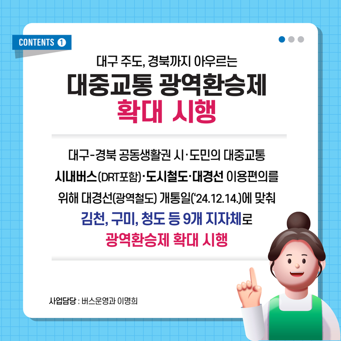 대구광역시는 12월 3일(수)부터 12월 5일(금)까지 청주 오스코에서 열리는 ‘2025 대한민국 정부혁신 박람회’에 참가해, 대구가 선도하는 초광역 대중교통 혁신 성과를 선보인다.