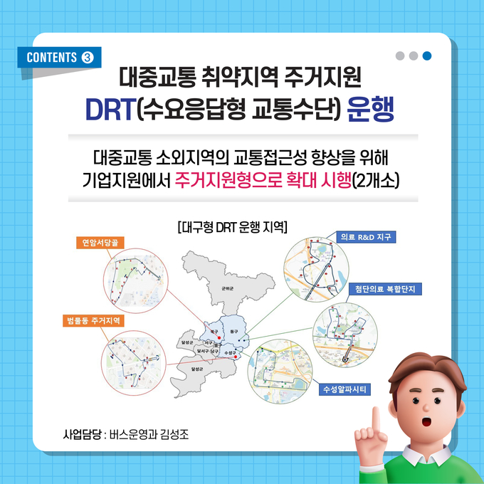 ※ (광역환승제) 대구와 경북 8개 지자체 연결, 대중교통 요금 50% 절감 효과(어르신 무임교통카드 상호 이용) 70세 이상 어르신, 대구와 경북 8개 지자체서 대중교통카드 무임 사용(대구형 DRT) 대중교통 취약지역인 북구 연암서당골, 수성구 범물동에 DRT 확대