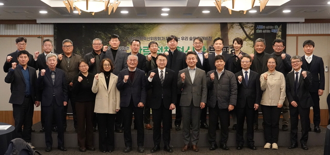 김인호 산림청장(앞줄 가운데)이 손승우 산림정책 혁신위원장(앞줄 오른쪽에서 다섯번째) 및 위원들과 ‘2030 지속가능한 미래를 여는 산림정책혁신안 발표회` 기념사진을 촬영하고 있다.