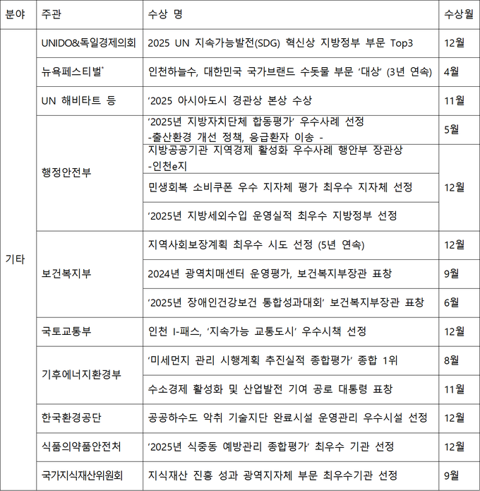 국내외 공인기관 주관, 2025년 인천시 수상·표창 내역