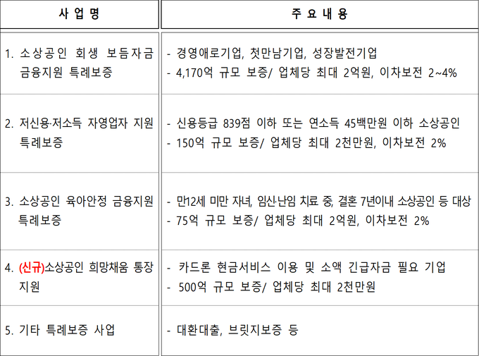 '소상공인 회생 보듬자금 금융지원 특례보증'은 지난해 3,750억 원에서 올해 4,170억 원으로 늘려, 경영애로기업과 첫 거래 기업, 성장 단계 기업을 대상으로 업체당 최대 2억 원까지 보증하고 2~4% 수준의 이차보전을 지원할 계획이다.