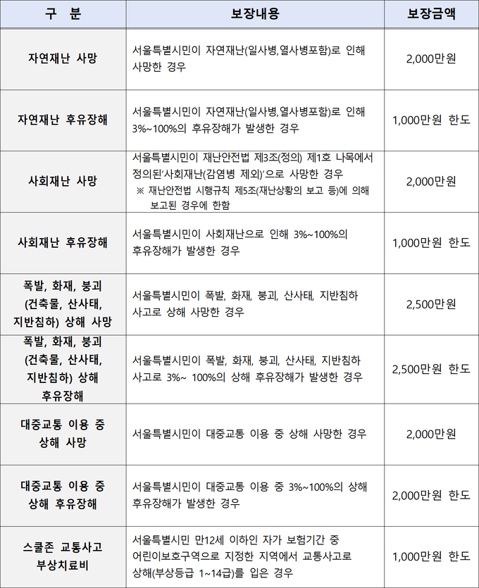서울시는 예기치 못한 재난과 대형사고로 피해를 입은 서울 시민과 유가족의 생계 안정을 지원하기 위해 올해 1월 1일부터 ‘시민안전보험’을 강화해 운영하고 있다.