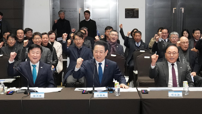 김영록 전라남도지사가 9일 여수 소노캄에서 열린 ‘2026여수세계섬박람회 도민보고회’에서 참석자들과 성공개최를 위한 파이팅을 외치고 있다.