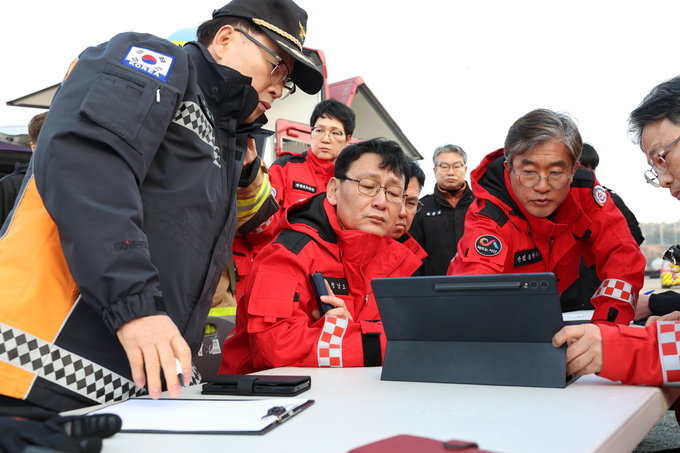 ※사진설명 : 21일 서산시 대산읍 산불 대응 현장 지휘본부에서 홍종완 충남도 행정부지사가 소방 관계자들과 산불 진화 및 확산 방지 대책을 논의하고 있다.