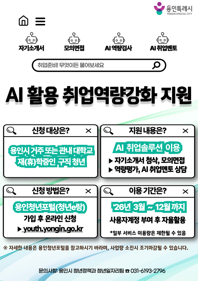 용인특례시(시장 이상일)는 인공지능(AI)을 활용한 취업역량강화 지원사업에 참여할 청년 구직자를 모집한다고 2일 밝혔다.