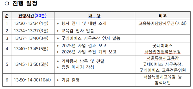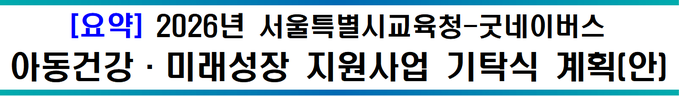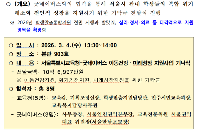 서울특별시교육청(교육감 정근식)은 3월 4일(수)에 굿네이버스(사무총장 전미선)와 ‘2026년 아동건강·미래성장 지원사업’ 기탁식을 갖고, 도움이 필요한 학생들의 건강한 성장을 위해 협력한다고 밝혔다.