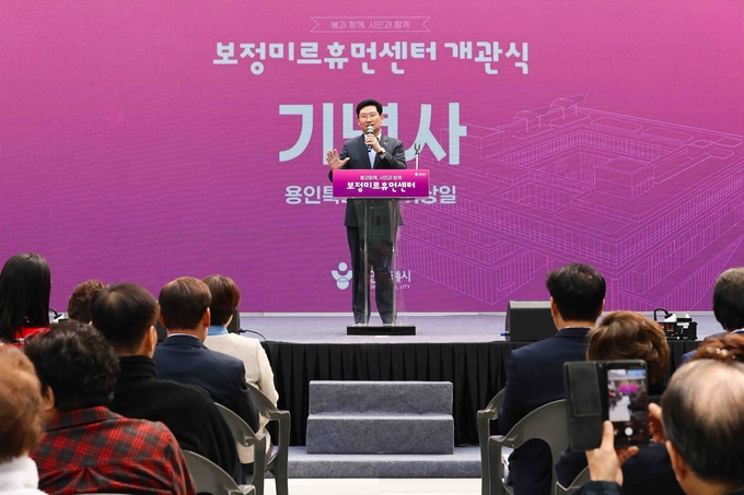 ▶이상일 용인특례시장이 1일 열린 '보정미르휴먼센터 개관식'에서 기념사를 하고 있다.