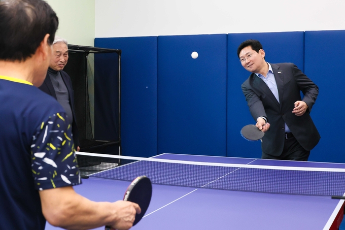 ▶이상일 용인특례시장이 1일 정식 운영을 시작한 '보정미르휴먼센터'에 마련된 탁구장을 방문해 시설을 점검했다.