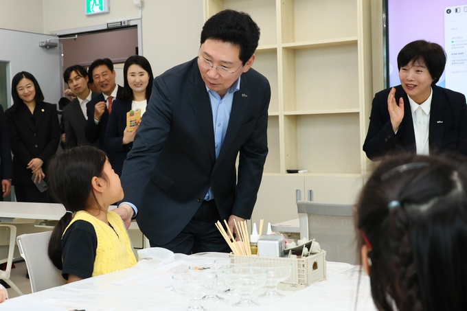 ▶이상일 용인특례시장이 1일 정식 운영을 시작한 '보정미르휴먼센터'에서 아이들과 인사를 나누고 있다.
