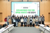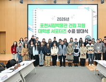 포천시는 지난 5일 포천시청 대회의실에서 2025년 하반기 대학생 서포터스 수료식과 2026년 상반기 대학생 서포터스 발대식을 개최했다. ‘포천시립박물관 건립 추진 지원 대학생 서포터스’는 2024년부터 운영 중인 프로그램으로, 포천시 관내 거주 대학생을 중심으로 포천시립박물관 건립 추진과 포천역사문화관 운영을 지원하는 역할을 수행하고 있다. 이날 행사는 수료증 및 위촉장 수여를 시작으로 2025년 하반기 우수 활동자 상장 수여, 활동 후기 발표, 포천시장과의 간담회 순으로 진행됐으며, 이후 포천역사문화관을 방문해 전시를 관람했다. 포천시 관계자는 “2025년 하반기 활동을 성실히 마친 대학생 서포터스 여러분께 감사드린다”며 “2026년 상반기 새롭게 활동을 시작하는 서포터스 학생들도 포천시립박물관 건립을 위한 열정적인 활동을 펼쳐주길 기대한다”고 말했다. 이어 “서포터스 활동을 통해 시립박물관 건립의 필요성에 대한 시민 공감대가 더욱 확산되기를 바란다”고 덧붙였다. 이번에 선발된 대학생 서포터스는 2026년 6월까지 활동하며, 포천시립박물관 건립 운동 현장 캠페인 지원을 비롯해 포천역사문화관 전시 및 교육프로그램 운영 지원, 홍보 활동 등 박물관 건립의 필