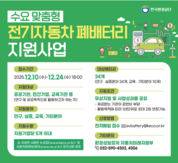 기후에너지환경부 산하 한국환경공단(이사장 임상준)은 10일부터 전기자동차 폐배터리 순환이용 촉진을 위한 ‘2025년도 2차 수요 맞춤형 전기자동차 폐배터리 지원사업’을 실시한다. 공단은 미래폐자원 거점수거센터를 운영해 ‘21년 이전 보조금을 지급받은 전기자동차 배터리를 반납받아 성능평가를 거쳐 민간에 공급하고 있으며, 폐배터리 확보가 어렵다는 관련 업계 의견을 적극 반영, 올해 6월 1차에 이어 2차 지원사업을 실시하게 됐다. 이번 지원사업은 폐배터리를 연구, 실증, 교육 등의 공익 목적으로 활용하려는 기업에 폐배터리를 무상으로 제공하는 것으로, 참여 희망기업이 매각 입찰 참가 자격을 보유하지 않아도 신청이 가능하다. 총 34개의 전기자동차 폐배터리 팩을 무상제공하며, 참여를 희망하는 기업은 연구‧실증 또는 교육‧기타로 분야를 구분해 배터리 종류에 상관없이 최대 5개까지 신청이 가능하다. 공단은 참여기업으로부터 연구·실증한 사업성과물을 제공받아 향후 배터리 해체 매뉴얼, 성능평가 기술개발 등에 활용할 예정이다. 참여를 희망하는 기업은 10일부터 24일까지 사업 접수용 이메일(evbattery@keco.or.kr)을 통해 신청이 가능하며, 사업계획서 평가를 통