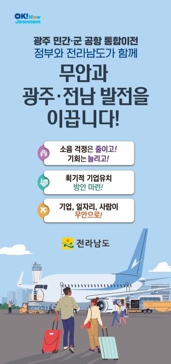 전라남도는 전남·광주·무안의 상생과 도민의 오랜 염원을 이루기 위해 광주 민간·군 공항의 무안국제공항 통합이전을 ‘더 이상 미룰 수 없는 시대적 과제’로 규정하고 강력히 추진할 계획이라고 밝혔다.