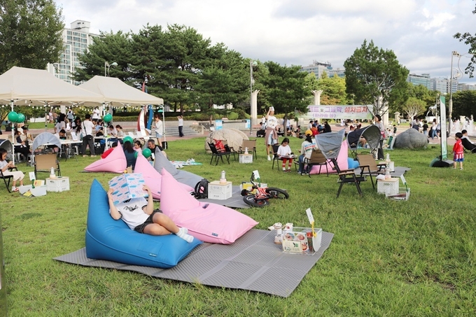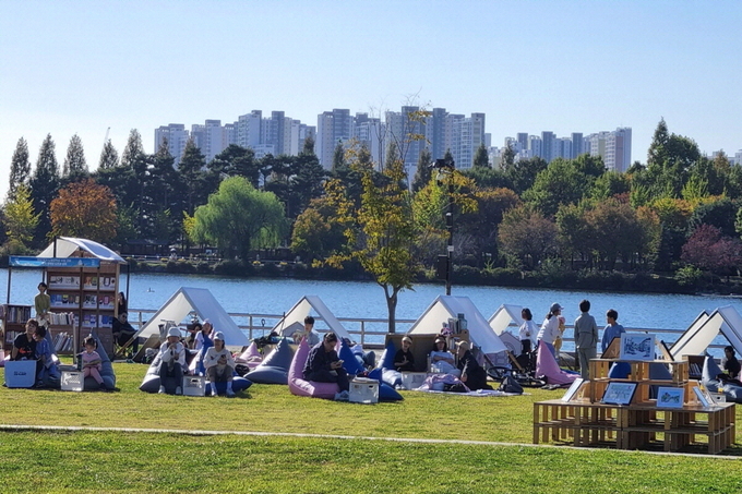 호숫가 잔디밭 야외도서관에서 책을 읽는 시민들(2024 고양 독서대전)