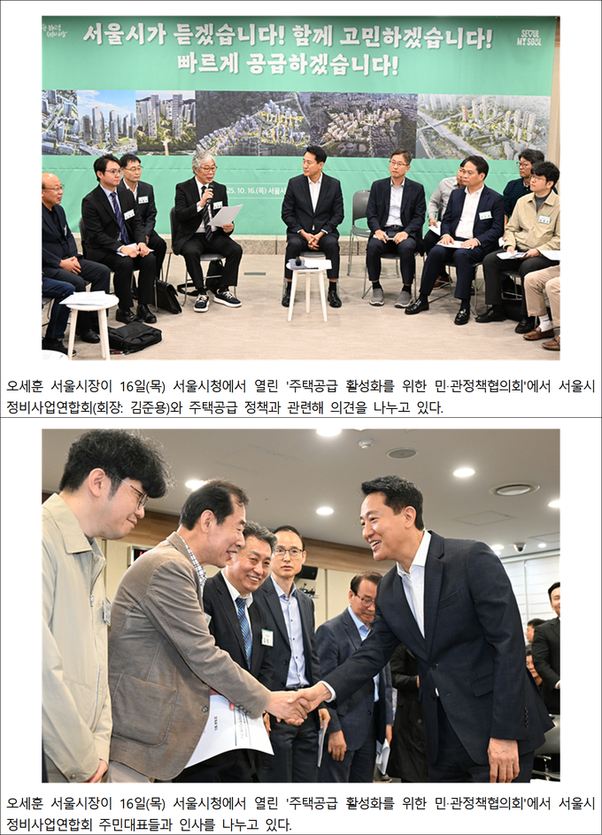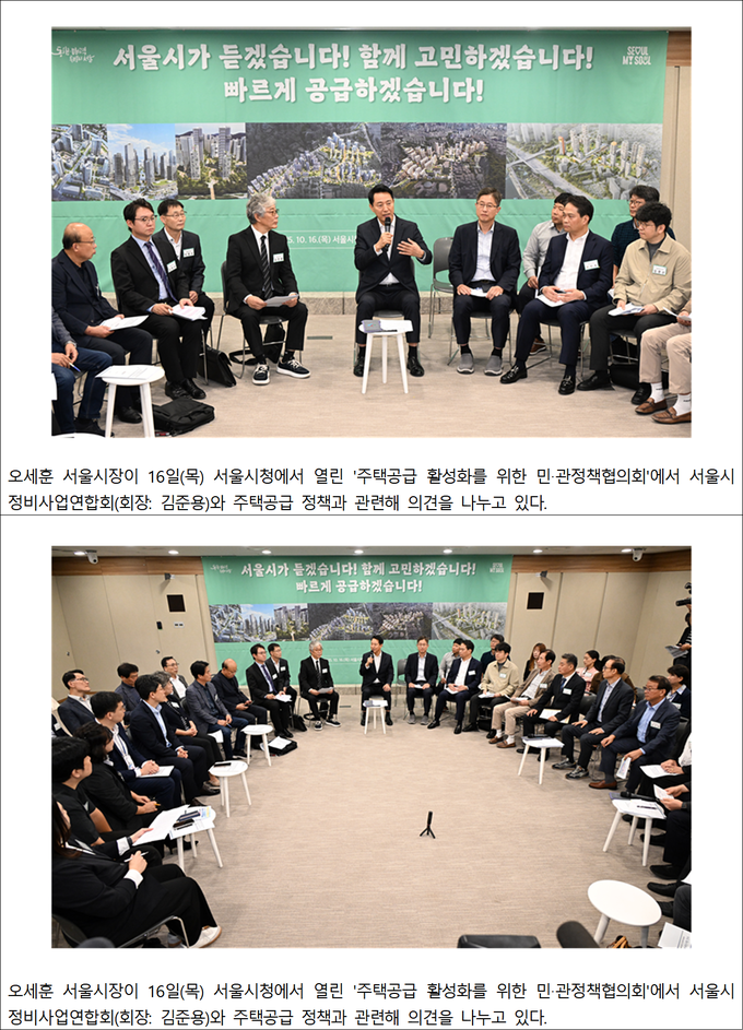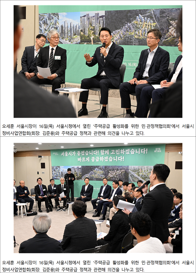 오세훈 서울시장이 16일(목) 오전 10시 서울시청 간담회장(8층)에서 ‘서울시 정비사업연합회’ 소속 주민대표들과 ‘주택공급 활성화를 위한 민‧관정책협의회’를 개최했다.