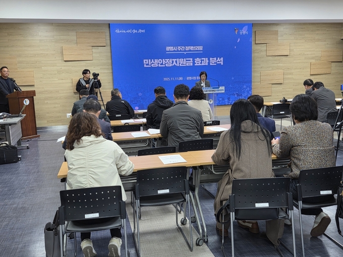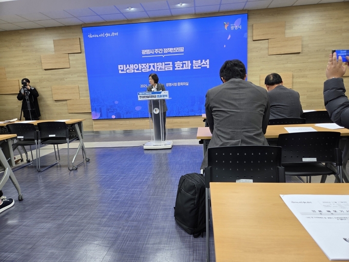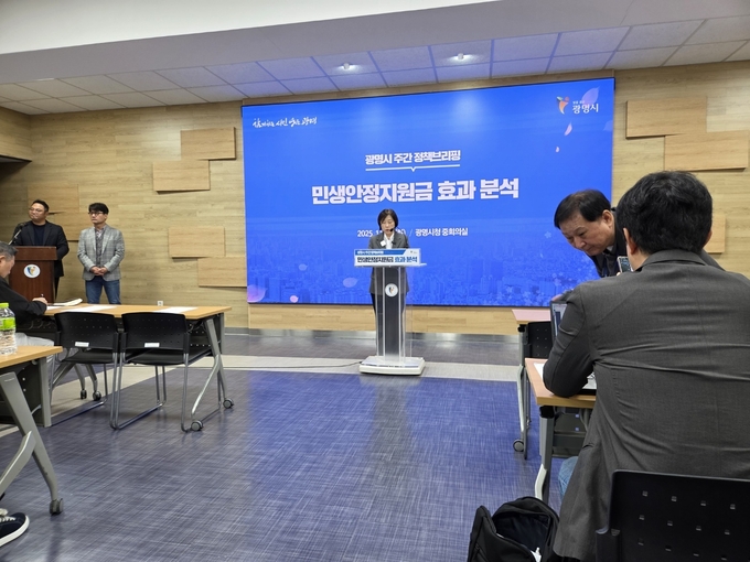 홍명희 경제문화국장이 11일 오전 시청 중회의실에서 열린 정책브리핑에서 '광명시 민생안정지원금 효과 분석 결과'에 대해 설명하고 있다.