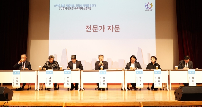철도 관련 전문가들이 지난 13일 시청 강당에서 열린 안양권 철도망 구축계획 설명회에서 안양권 철도망 구축계획에 대해 발언하고 있다.