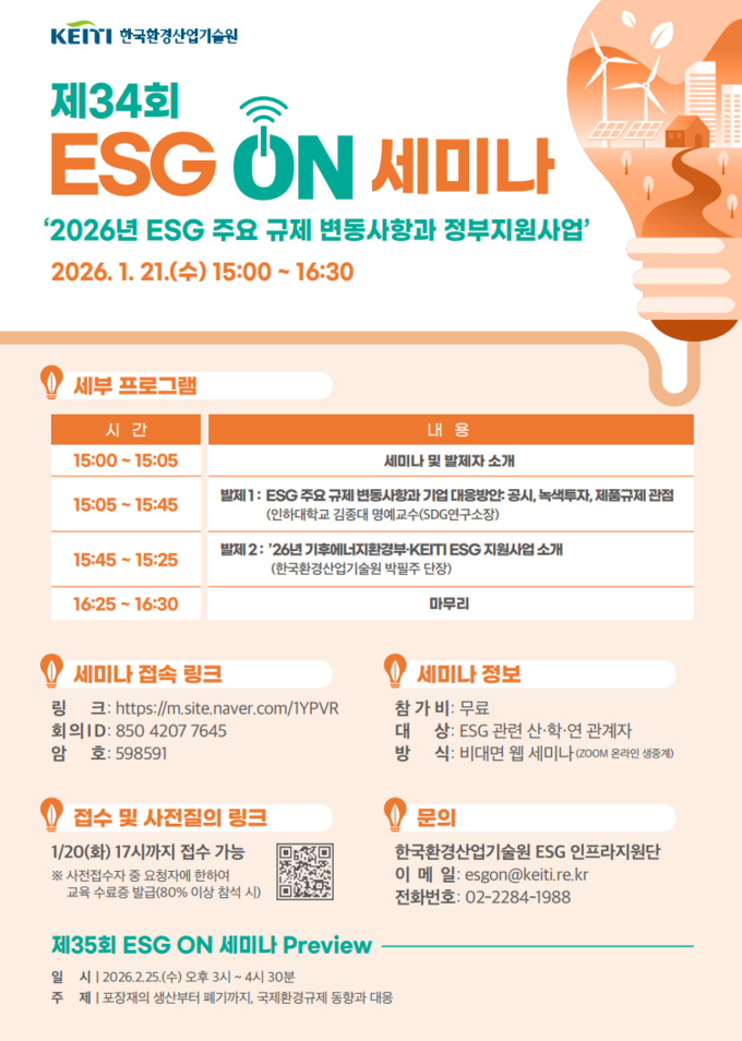 한국환경산업기술원은 2026년 1월 21일 오후 3시 환경·사회·투명경영(ESG) 규제의 핵심 변동 사항과 기후에너지환경부 및 한국환경산업기술원의 정부 지원사업을 소개하는 ‘제34회 이에스지(ESG) 온(ON) 세미나’를 온라인으로 개최한다.