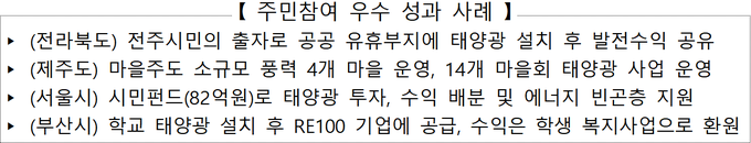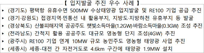 * (재생에너지 보급 확대 계획 주요내용) 유휴부지 및 국민 일상공간 중심으로 태양광 보급 확대, 공공기관 ‘한국형 RE100(K-RE100)’ 이행을 통한 재생에너지 대전환 선도 등