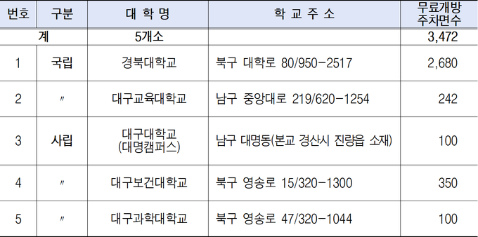 ❍ 대구지역 대학(국립2, 사립3) : 2. 13(금) ~ 2. 18.(수) / 5개소(3,472면)