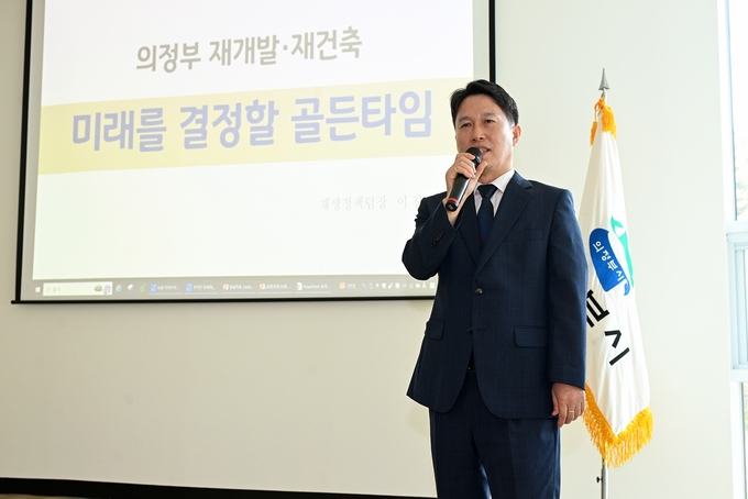 ▶사진 설명 3번: 이징우 재생정책팀장이 10월 1일 ‘2025년 10월 미래가치 공유플러스+의 날’ 행사에서 ‘의정부시 재개발‧재건축 미래를 결정할 골든타임’을 주제로 발표하고 있다.
