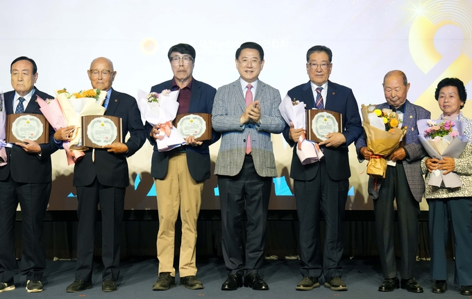 김영록 전라남도지사가 14일 영암 호텔현대 바이 라한 목포에서 열린 ‘제29회 전라남도 노인의 날 기념식’에 참석해 유공자에게 표창장을 수여한 뒤 기념촬영을 하고 있다.