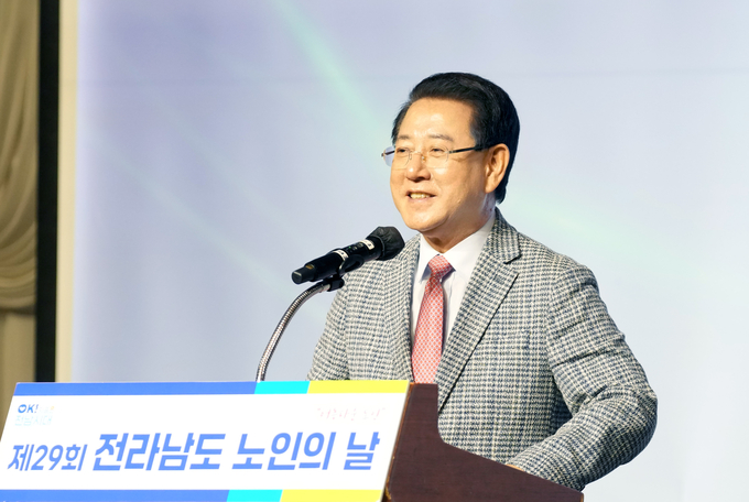 김영록 전라남도지사가 14일 영암 호텔현대 바이 라한 목포에서 열린 ‘제29회 전라남도 노인의 날 기념식’에 참석해 인사말을 하고 있다.
