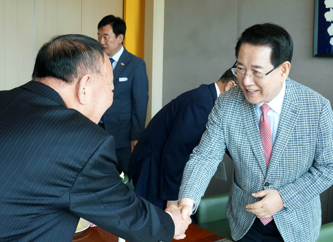 김영록 전라남도지사가 14일 영암 호텔현대 바이 라한 목포에서 열린 ‘제29회 전라남도 노인의 날 기념식’에 참석해 참석자들과 인사를 나누고 있다.