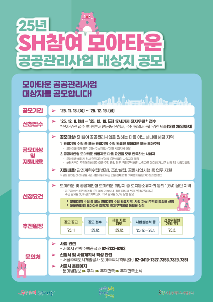 서울시는 올해 ‘SH참여 모아타운 공공관리사업’ 대상지 공모를 11월 13일 공고하고, 오는 12월 8일부터 19일까지 신청받는다고 밝혔다. 공모 대상지를 ’24년 10곳에서 ’25년 15곳 내외로 50% 확대해 선정하고, 대상지 폭을 넓혀 신규로 모아타운을 희망하는 구역, 주민 스스로 사업추진에 어려움을 겪는 구역 등도 공공이 직접 참여해 사업을 도울 수 있도록 한다.