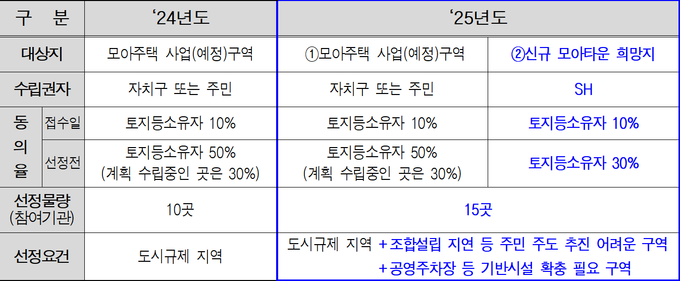 기존엔 ▴규제완화로 사업성을 확보할 수 있는 구역, ▴용도지역 상향 등 인센티브를 적용하기 쉬운 구역 등 사업성이 부족한 구역을 위주로 선정했다. 올해는 ▴전문성 부족 등으로 주민 스스로 사업을 추진하기 어려운 구역, ▴지역 특성을 고려했을 때 주차장·도로·공원 등 정비기반시설이 부족한 구역을 새로 추가해 공공의 지원을 받을 수 있게 한다.