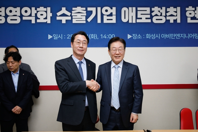정명근 화성특례시장과 이재명 당시 더불어민주당 당패표가 악수를 하고 있다.