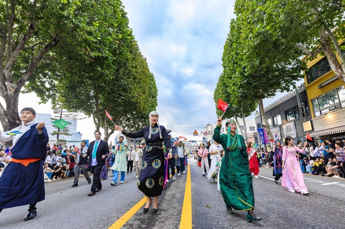 정조대왕능행차 공동재현 퍼레이드에 외국인들이 참여하고 있다.