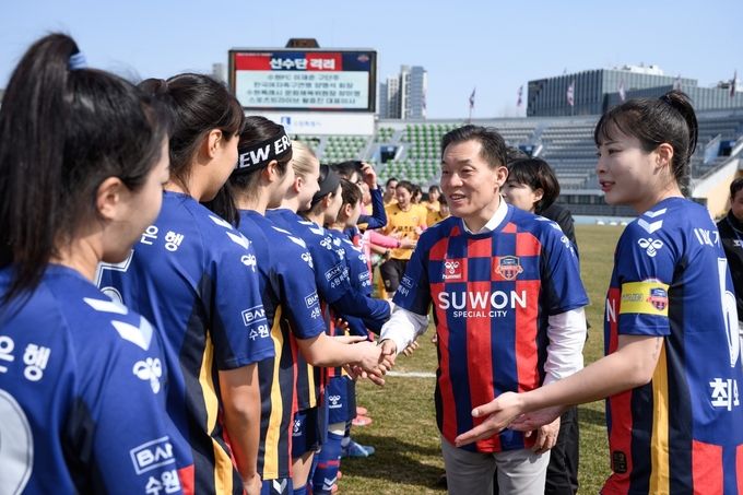 이재준 수원특례시장이 수원FC위민 선수단을 격려하고 있다.
