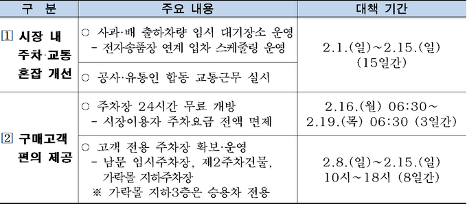 아울러 일반 소비자가 가락시장을 이용하는 데에 불편함이 없도록 2월 8일(일)부터 2월 15일(일)까지 8일간 남문 주차장, 제2주차건물, 가락몰 지하주차장을 구매고객 전용 주차장으로 운영하며, 설 연휴 가락시장을 찾는 고객들의 주차요금 부담을 줄이고자 휴장 기간인 2월 16일(월) 오전 6시 30분부터 2월 19일(목) 오전 6시 30분까지 3일간 주차장을 24시간 동안 무료 개방한다.